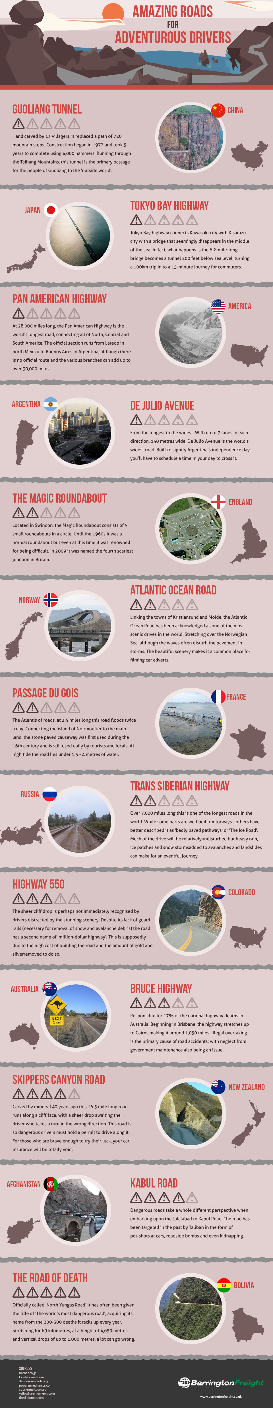 Well we thought It would be interesting to look at some of the most amazing roads on earth, form the technically masterful, absolutely bizarre to the downright dangerous. So take a look at the infographic below and let us know which road you would like to cruise down most.
