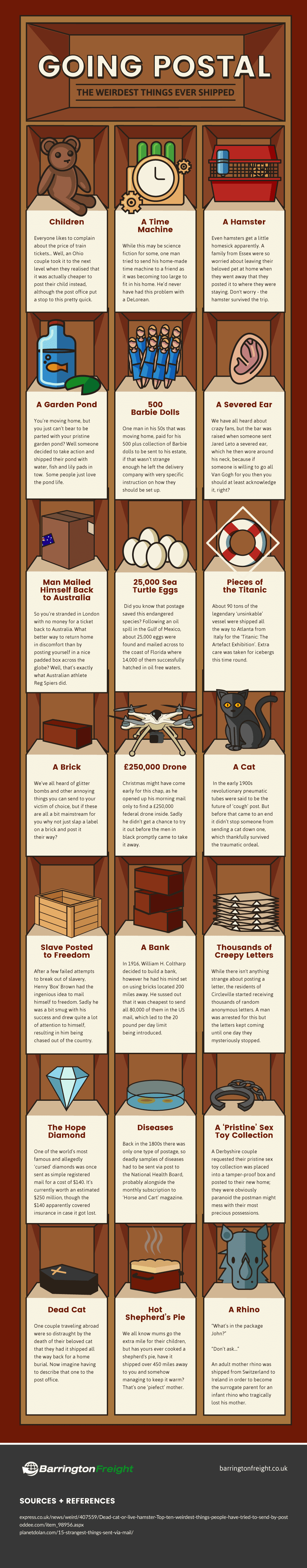 From children (Yes, actual children), to an entire building or even a man posting himself back to Australia there have been some truly bizarre objects sent around the world. So take a look at the infographic below and let us know the weirdest thing you have ever sent or received.